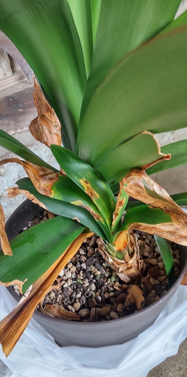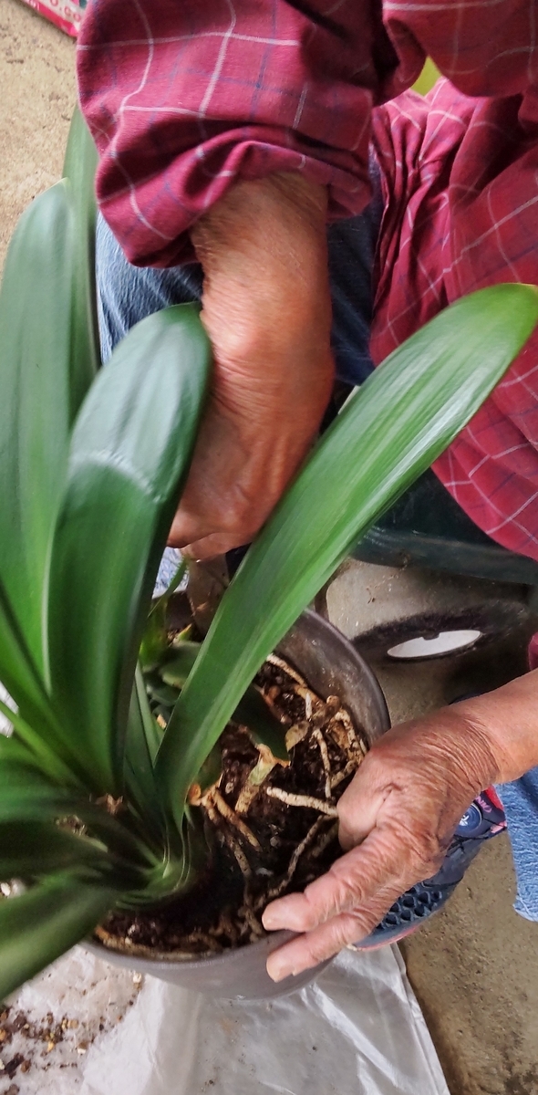 こうしないと、クンシランの株が大きくなりすぎているので、鉢から抜くことができないのだ。